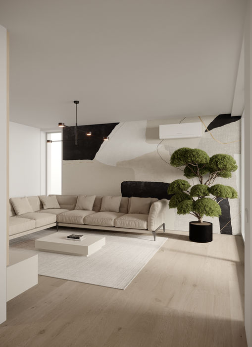 This modern minimalist apartment combines a soft off-white palette with warm Vicenza oak accents to create a bright, welcoming atmosphere. The design embraces clean lines and an open layout that feels both contemporary and homey.
