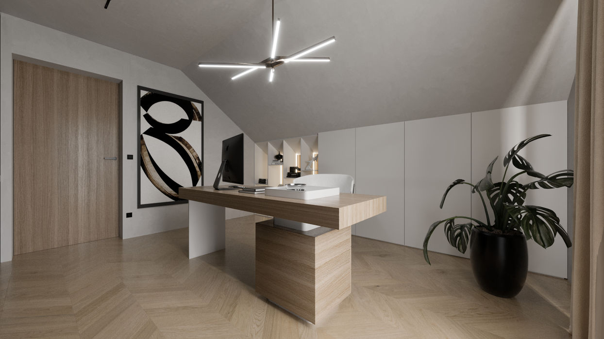 This interior is thoughtfully designed to balance functionality. A soft, neutral color palette sets a serene foundation, offering calmness and clarity in the everyday environment.