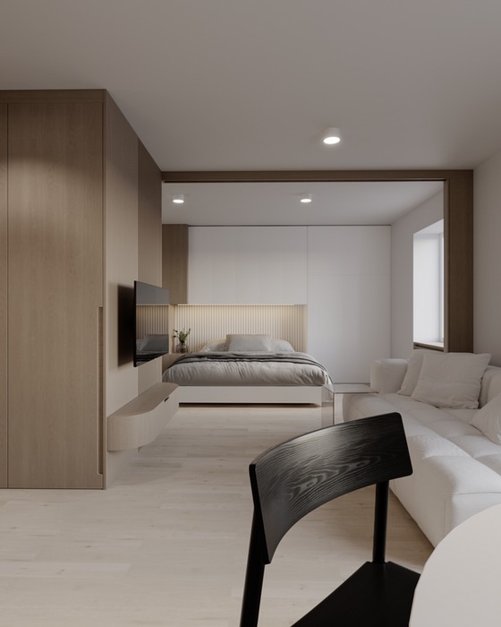 This renovation project transforms an old apartment into a calm and modern living space with a distinct Japandi influence. The interior features a soft blend of natural wood tones, light greys, and clean whites, creating a balanced and serene atmosphere.